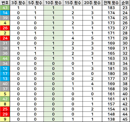 10주 당첨횟수 하위권 번호들은 다음과 같습니다.