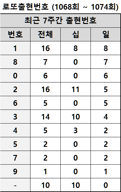 1068회에서 1074회까지 최근 7주간 당첨된 번호들도 십의자리와 일의자리에 나온 숫자들을 분석했습니다.