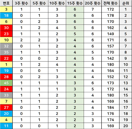 15주 당첨횟수가 높은 상위권 20개 로또번호들입니다.