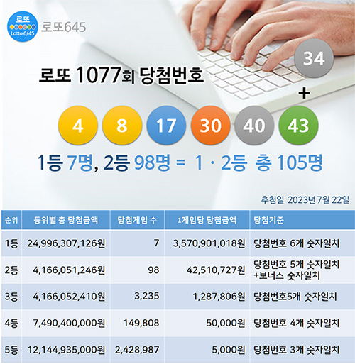 1077회 로또 당첨번호는 4번 8번 17번 30번 40번 43번이 1등 번호에 추첨되었고, 2등 보너스 번호는 34번으로 확인됩니다.