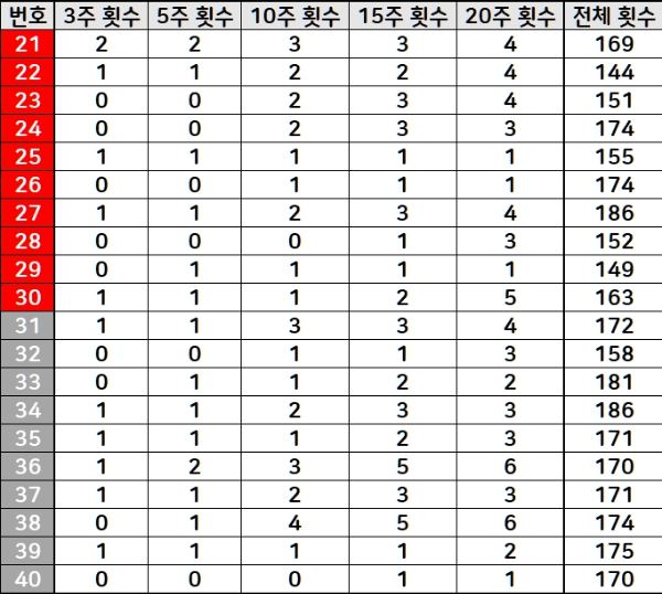 45개 로또복권 번호 각각 기간별로 출현횟수를 조사하였고, 전체 횟수에는 현재까지 로또복권에 당첨된 횟수를 계산하였습니다.