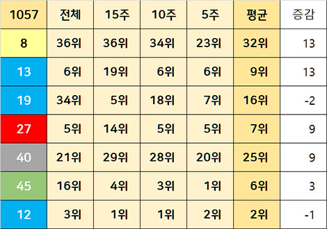 직전 1057회 로또 당첨번호 7개 숫자를 45개 번호 순위로 계산한 표입니다.