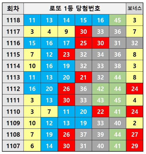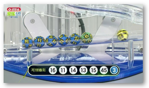 1118회 당첨번호 중 11, 13, 15, 16은 최근 5주 이내에 자주 출현한 뜨거운 수입니다. 반면 14, 45는 5주 이내 나오지 않은 차가운 수입니다.