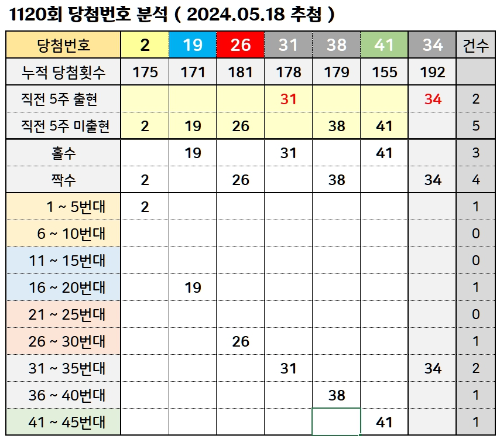 - 2, 19, 26, 31, 38, 41번은 1120회 당첨번호에서 다시 나올 가능성이 있다고 판단했어요. 특히 2, 19, 31번은 최근 자주 등장한 번호들이에요.