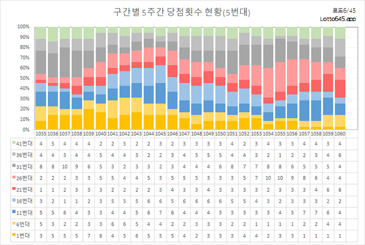 다음은 로또 추첨 회차별 5주간 당첨횟수를 번호대별로 분석한 통계입니다.
