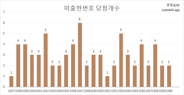로또 추첨 회차별 5주간 미출현 번호 당첨개수 통계입니다. 1061회차는 미출현 상승 분위기가 느껴지나요?