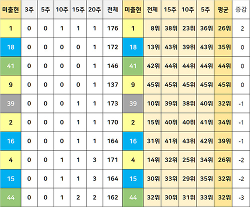 아래는 5주간 미출현 번호를 찾아서, 15주간 출현 순위 대비하여 5주간 출현 순위를 비교하여 증감을 계산하고 증감폭으로 정렬했습니다.