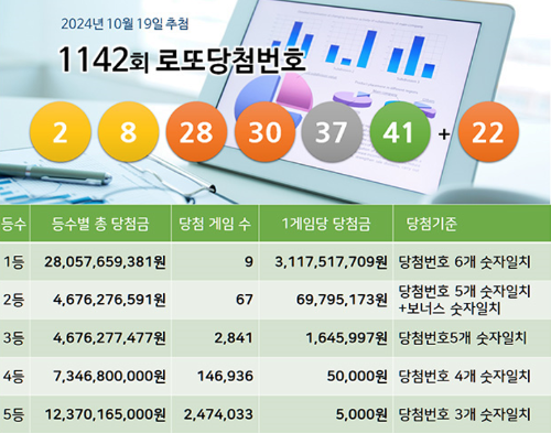 1142회 로또 추첨 결과, 1등 당첨번호는 2, 8, 28, 30, 37, 41이었고, 보너스 번호는 22였습니다. 이번 회차에서 주목할 만한 특징들이 몇 가지 있었습니다.