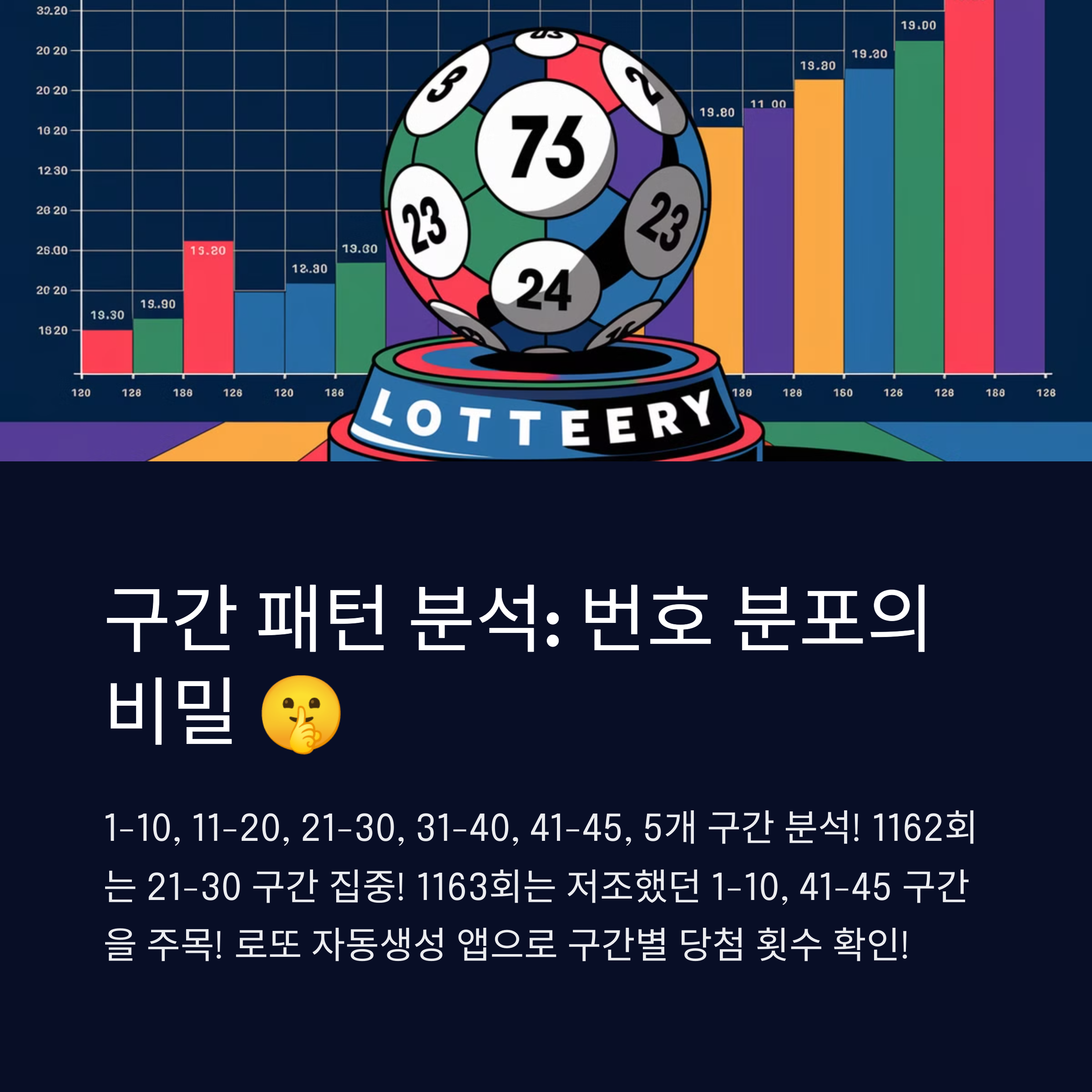 로또번호 자동생성 앱의 '출현번호 통계' 메뉴에서는 번호대별 당첨횟수를 확인할 수 있어, 구간별 출현 빈도를 쉽게 파악할 수 있습니다. 이를 통해 1163회 예상번호 선정 시 각 구간별로 적절한 비율로 번호를 선택하여 2등, 3등 당첨 확률을 높일 수 있습니다.