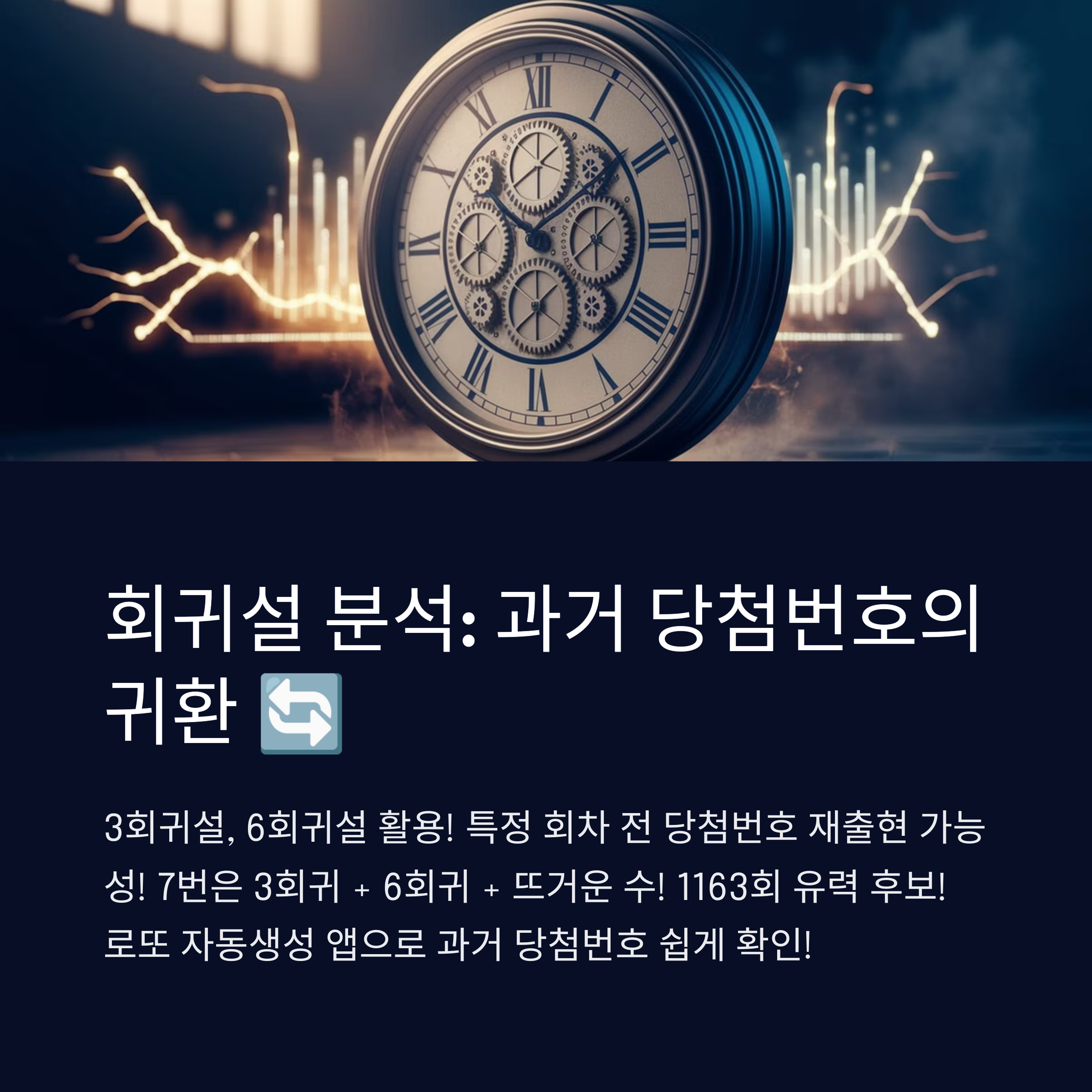 회귀설은 특정 회차 이전에 당첨된 번호가 일정 주기를 두고 다시 당첨될 가능성이 있다는 이론입니다. 일반적으로 3회귀설, 6회귀설, 9회귀설 등 다양한 주기를 분석합니다.