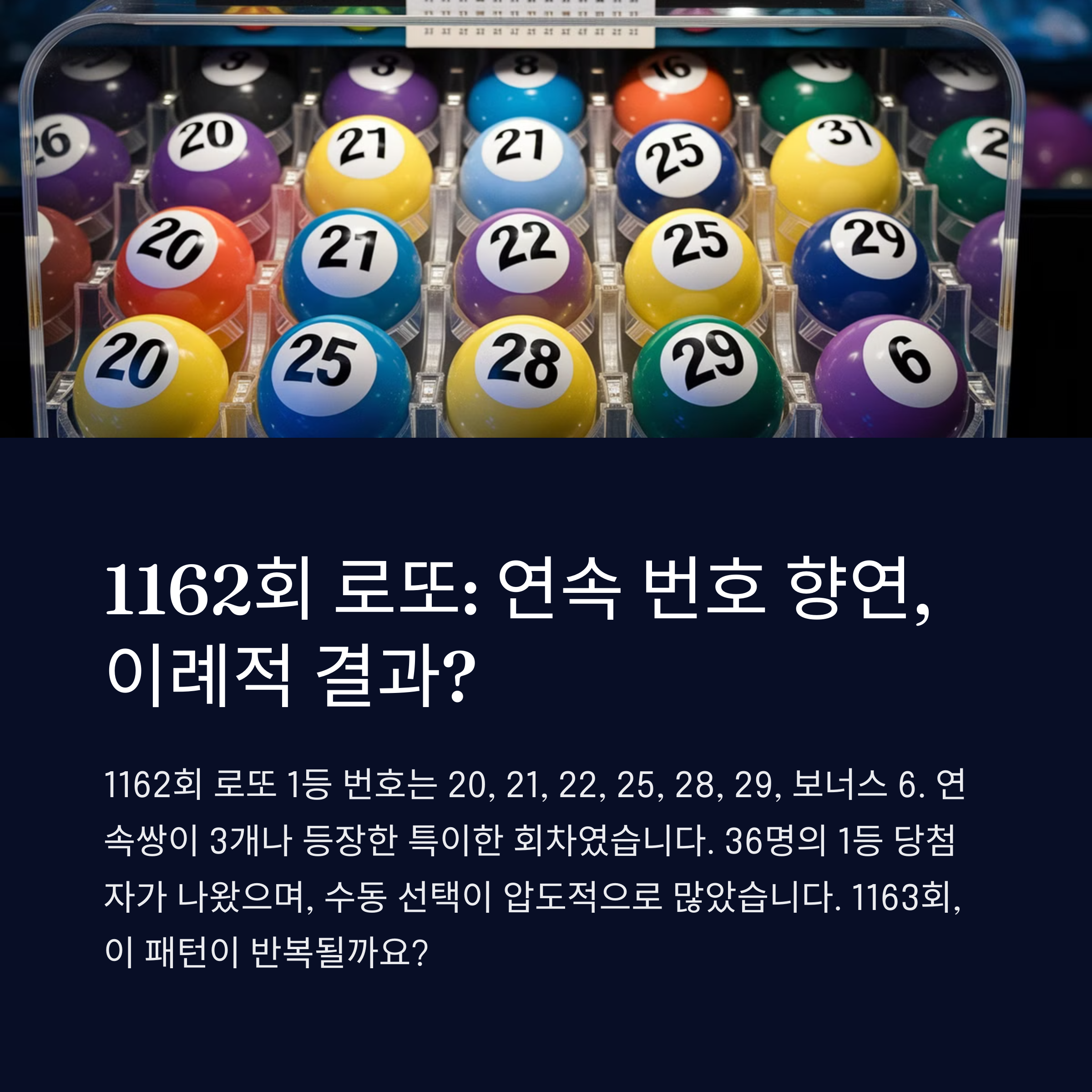 로또 1163회 당첨번호를 예측하기 위해 최근 1162회 당첨결과를 분석해보겠습니다. 1162회 로또 추첨에서는 무려 36명의 1등 당첨자가 나왔으며, 1인당 약 8억 2천만원의 당첨금이 지급되었습니다. 이번 분석에서는 역대 누적 당첨횟수, 최근 5주간 당첨번호 출현 패턴, 모의번호 분석 등 다양한 통계적 접근을 통해 1163회 로또 예상번호를 제시하겠습니다.